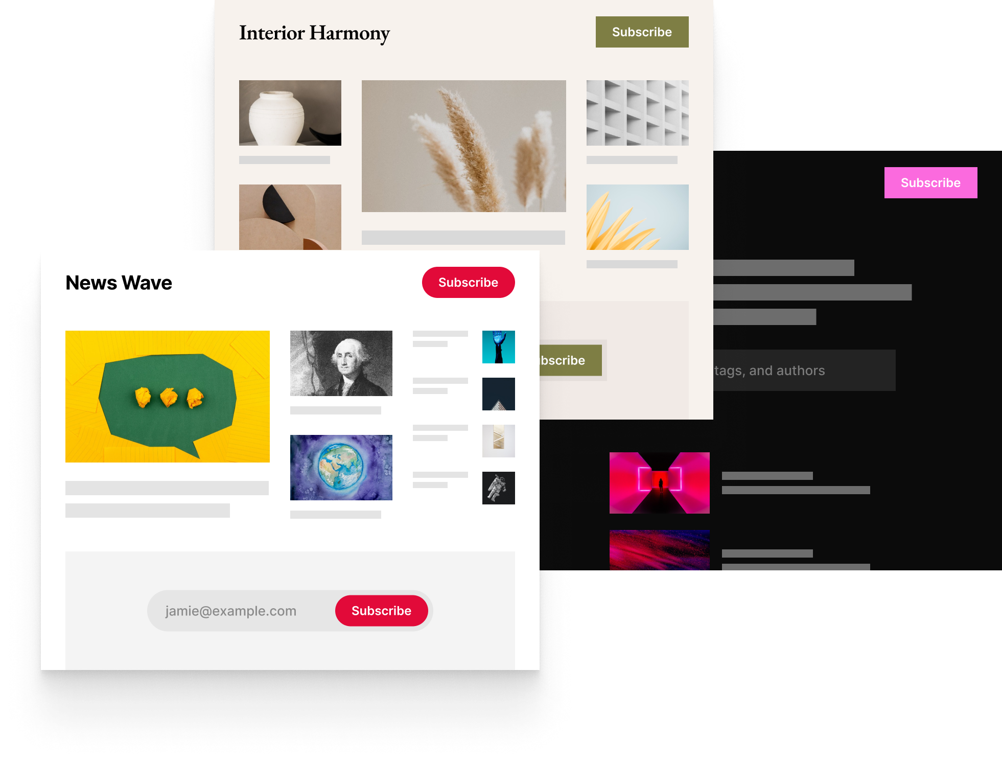 Highlight and Magazine styles are perfect for content-rich publications, while Landing and Search are a more versatile choice for publications of all types – newsletters, blogs, docs, and more.